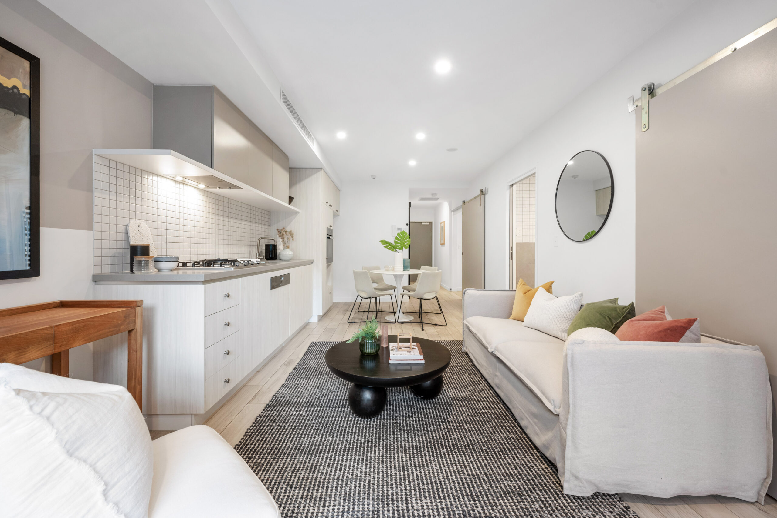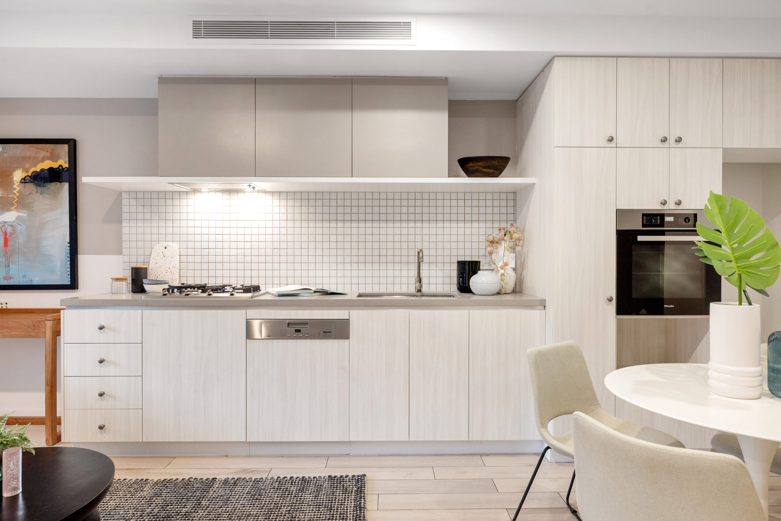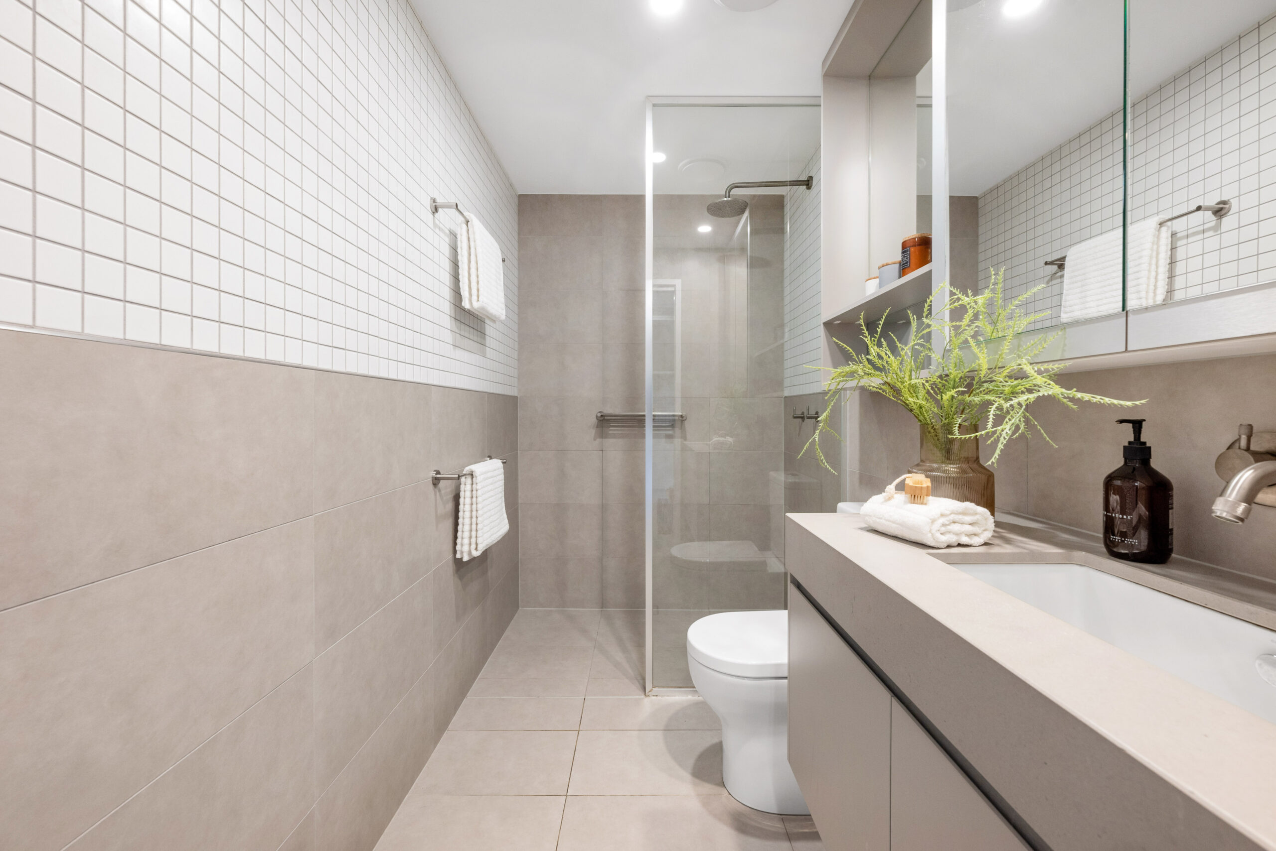• Soft toned décor and timber look finishes create relaxed vibe