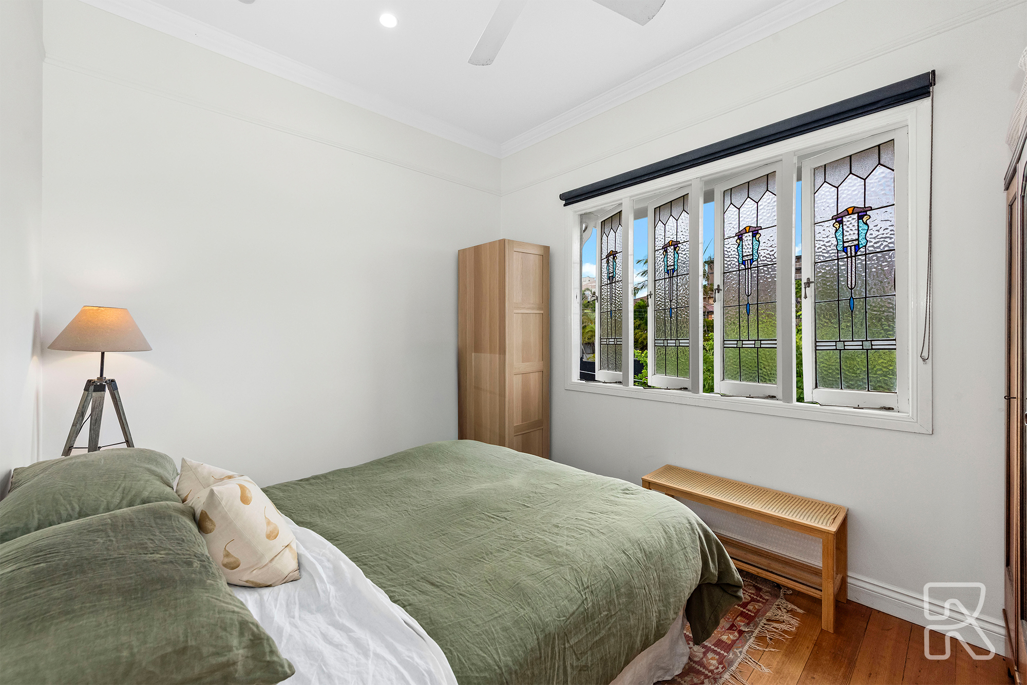 • Generous bedroom with ceiling fan and character windows